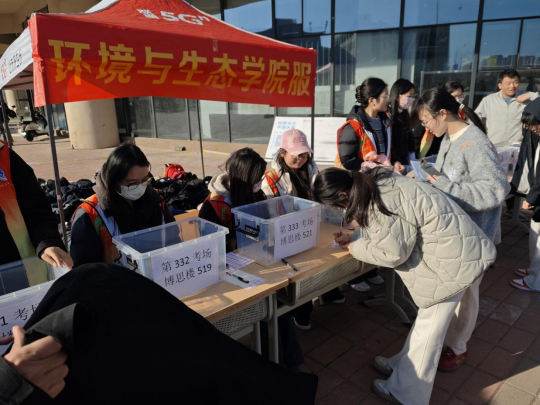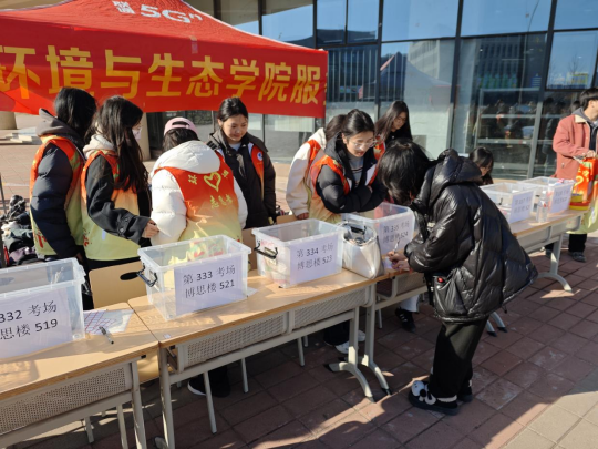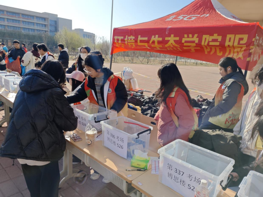 考试当天,志愿者们提前抵达考点,迅速按照分工投入岗位。在考点入口,一部分志愿者耐心引导考生上交手机等电子设备,维护考试公平;另一部分志愿者则认真保管考生的书包等物品,仔细核对、妥善存放,让考生得以轻装上阵。服务全程,志愿者们始终热情周到,用真诚的微笑和温暖的话语缓解考生的紧张情绪,营造出温馨的考试氛围。