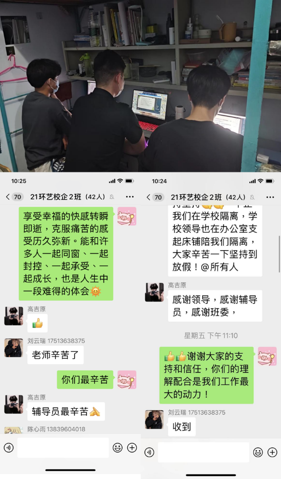 关注员工健康的同时,我不忘叮嘱同学们,虽然是特殊时期,但是仍要以学习为重。越是艰难时刻,越能考验大家的毅力。网课期间,在师生的共同努力下,同学们坚持做到了停课不停学,收获了成长,给大学时光留下了难忘的回忆。
