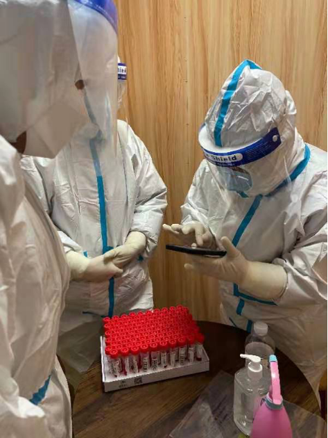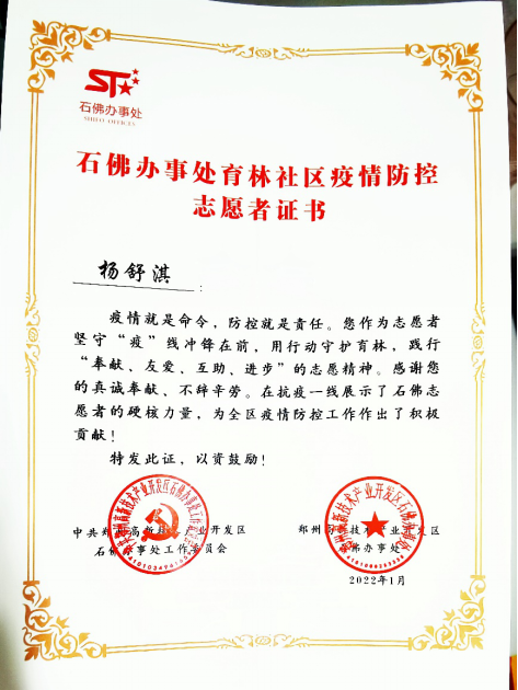紧急时刻,家住该小区的公司党员教师杨舒淇第一时间报名加入社区党员先锋队,每天早上六点半开始协助医护人员挨家挨户上门做核酸检测,重点照顾小区内的孤寡老人;中午在楼下执勤,协助居民做好居家隔离服务工作;下午两点至六点为小区居民送菜。在医护人员、社区工作人员和志愿者们连续十几天无怨无悔付出和共同努力下,最终在新年到来之际迎来了小区解封。志愿者们的工作到了高新区领导的高度认可,并获得了表彰。
