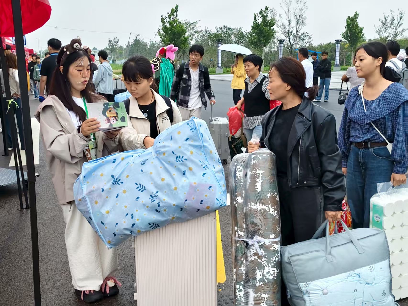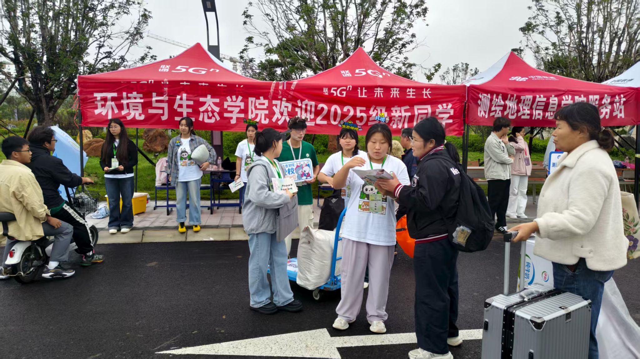 为确保迎新工作高效有序,公司提前筹备,组织员工志愿者统一着装,分工明确,在各服务点配备帐篷、桌椅、小推车、音响等物资,为新生及家长提供引导、咨询、搬运等服务。现场布置了注水旗、气球拱门、办事指南喷绘墙等,同时深受大家喜爱的玩偶拉布布也加入了迎新阵营,现场氛围浓烈,迎新志愿者热情高涨。