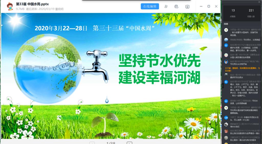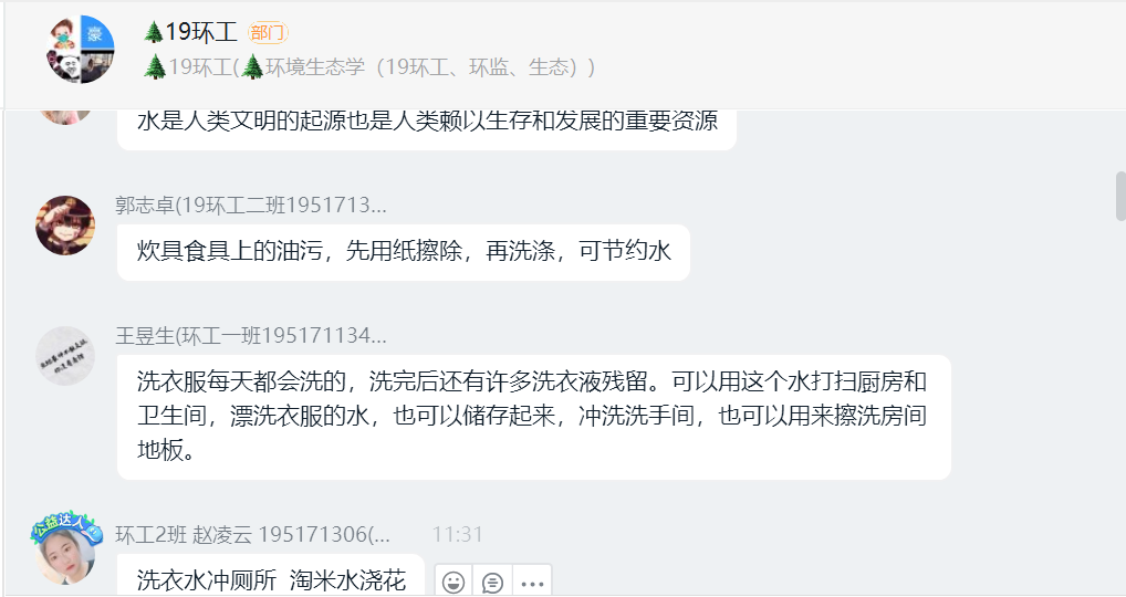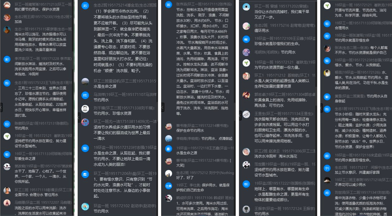 活动紧扣主题,形式多样。一是任课教师董晓明结合正在开展的网课《环境生态学》教学内容,向19级环工、环境监测、生态班员工介绍水法律、环保及节水、水与生态、河湖保护治理与河长制等相关知识,组织六个班221名员工在线学习讨论;二是在全系广老员工中开展以“节水、爱水、护水”为主题的手抄报、绘画、拍视频、朗诵等活动。目前,已收到各类作品62件,宣传活动还在继续进行中。