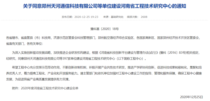 12月25日,省科技厅公布了2020年度新建河南省工程技术研究中心名单(豫科基〔2020〕18号),公司董事长郑志宏教授主持申报的“河南省水生态智能装备工程技术研究中心”获批建设。